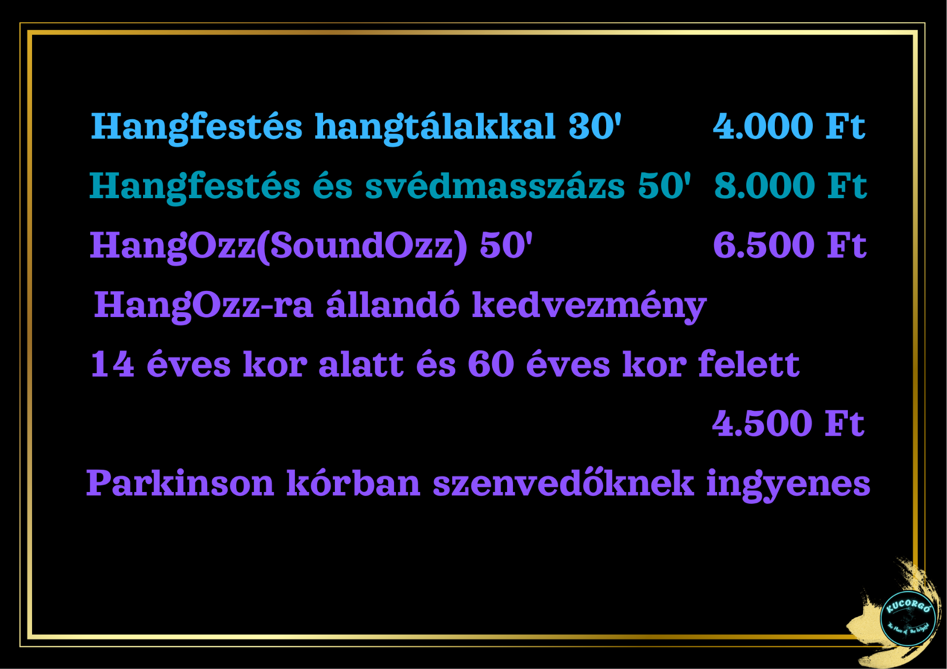 Többféle masszázs megtalálható a Kucorgóban, amelyek feszültségoldó, frissítő, relaxáló jellegűek: svédmasszázs, fejmasszázs, bambusszal és kövekkel történő masszázs, köpölyözés, Access Consciousness technikái ..